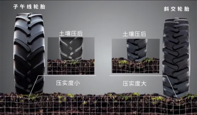试验数据显示,子午线轮胎接地面积优势显著。在相同的胎压下,前进子午线胎平均接地面积比其他竞品和斜交轮胎的更宽,子午线轮胎的对土壤压实度更小,进而提升联合收割机的动力性能。值得注意的是,子午线轮胎仅产生周向形变,径向保持稳定,而斜交胎则径向周向均发生形变,这为其性能突破奠定了结构基础。