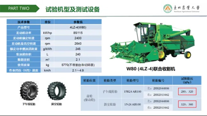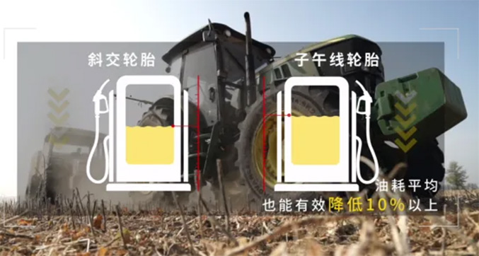 田间作业中,在相同胎压下,子午线轮胎收割机作业速度比斜交胎更快速,滑转率更低,有效降低了湿软田地陷车打滑风险。在道路和田间工况,配置胎压280kPa子午线轮胎的联合收割机牵引功率均显著提高,耗油率均显著降低。且在重载工况下仍能保持稳定油耗,综合燃油经济性突出。